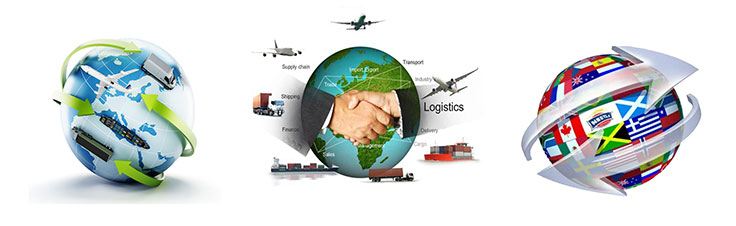 Illustration: Globe with ship, airplane, truck, and train going around it.